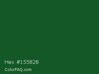 Hex #155828 Color is a very dark green color and the nearest color is Cal Poly Pomona Green #1e4d2b. Hex code #155828 and RGB value is rgb(21,88,40). In RGB color space, this color is composed of 8% red, 35% green, 16% blue, In CMYK color space, this color is composed of 76% cyan, 0% magenta, 55% yellow , 65% black , In HSL color space, this color has a hue angle of 137° , 61% saturation and 21% lightness.