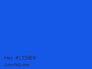 Hex #1558e8 Color is a normal blue color and the nearest color is Blue RYB #0247fe. Hex code #1558e8 and RGB value is rgb(21,88,232). In RGB color space, this color is composed of 8% red, 35% green, 91% blue, In CMYK color space, this color is composed of 91% cyan, 62% magenta, 0% yellow , 9% black , In HSL color space, this color has a hue angle of 221° , 83% saturation and 50% lightness.