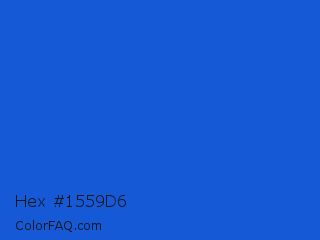 Hex #1559d6 Color is a normal blue color and the nearest color is New Car #214fc6. Hex code #1559d6 and RGB value is rgb(21,89,214). In RGB color space, this color is composed of 8% red, 35% green, 84% blue, In CMYK color space, this color is composed of 90% cyan, 58% magenta, 0% yellow , 16% black , In HSL color space, this color has a hue angle of 219° , 82% saturation and 46% lightness.