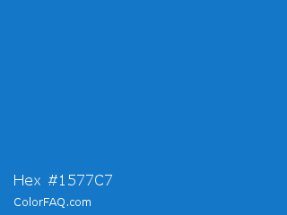 Hex #1577c7 Color is a normal blue color and the nearest color is Bright Navy Blue #1974d2. Hex code #1577c7 and RGB value is rgb(21,119,199). In RGB color space, this color is composed of 8% red, 47% green, 78% blue, In CMYK color space, this color is composed of 89% cyan, 40% magenta, 0% yellow , 22% black , In HSL color space, this color has a hue angle of 207° , 81% saturation and 43% lightness.