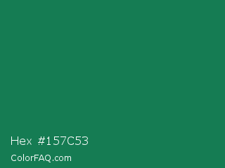 Hex #157c53 Color is a dark green color and the nearest color is Salem #097f4b. Hex code #157c53 and RGB value is rgb(21,124,83). In RGB color space, this color is composed of 8% red, 49% green, 33% blue, In CMYK color space, this color is composed of 83% cyan, 0% magenta, 33% yellow , 51% black , In HSL color space, this color has a hue angle of 156° , 71% saturation and 28% lightness.
