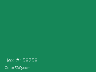 Hex #158758 Color is a normal green color and the nearest color is Deep Green Cyan Turquoise #0e7c61. Hex code #158758 and RGB value is rgb(21,135,88). In RGB color space, this color is composed of 8% red, 53% green, 35% blue, In CMYK color space, this color is composed of 84% cyan, 0% magenta, 35% yellow , 47% black , In HSL color space, this color has a hue angle of 155° , 73% saturation and 31% lightness.