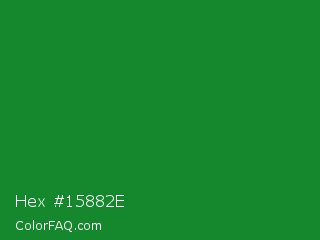 Hex #15882e Color is a normal green color and the nearest color is Forest Green #228b22. Hex code #15882e and RGB value is rgb(21,136,46). In RGB color space, this color is composed of 8% red, 53% green, 18% blue, In CMYK color space, this color is composed of 85% cyan, 0% magenta, 66% yellow , 47% black , In HSL color space, this color has a hue angle of 133° , 73% saturation and 31% lightness.