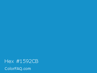 Hex #1592cb Color is a normal blue color and the nearest color is Cyan Cornflower Blue #188bc2. Hex code #1592cb and RGB value is rgb(21,146,203). In RGB color space, this color is composed of 8% red, 57% green, 80% blue, In CMYK color space, this color is composed of 90% cyan, 28% magenta, 0% yellow , 20% black , In HSL color space, this color has a hue angle of 199° , 81% saturation and 44% lightness.