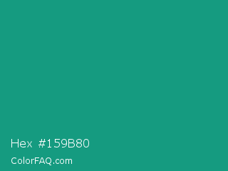 Hex #159b80 Color is a normal cyan color and the nearest color is Gossamer #069b81. Hex code #159b80 and RGB value is rgb(21,155,128). In RGB color space, this color is composed of 8% red, 61% green, 50% blue, In CMYK color space, this color is composed of 86% cyan, 0% magenta, 17% yellow , 39% black , In HSL color space, this color has a hue angle of 168° , 76% saturation and 35% lightness.
