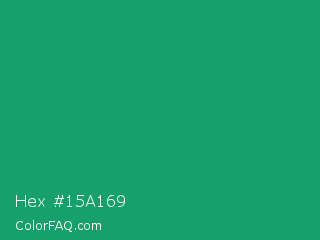 Hex #15a169 Color is a normal green color and the nearest color is Green Crayola #1cac78. Hex code #15a169 and RGB value is rgb(21,161,105). In RGB color space, this color is composed of 8% red, 63% green, 41% blue, In CMYK color space, this color is composed of 87% cyan, 0% magenta, 35% yellow , 37% black , In HSL color space, this color has a hue angle of 156° , 77% saturation and 36% lightness.