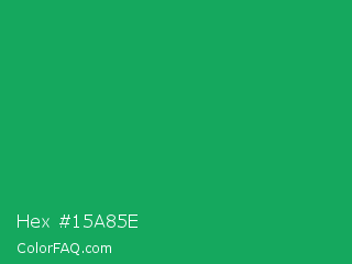 Hex #15a85e Color is a normal green color and the nearest color is GO Green #00ab66. Hex code #15a85e and RGB value is rgb(21,168,94). In RGB color space, this color is composed of 8% red, 66% green, 37% blue, In CMYK color space, this color is composed of 88% cyan, 0% magenta, 44% yellow , 34% black , In HSL color space, this color has a hue angle of 150° , 78% saturation and 37% lightness.