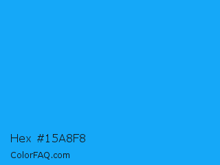 Hex #15a8f8 Color is a normal blue color and the nearest color is Button Blue #24a0ed. Hex code #15a8f8 and RGB value is rgb(21,168,248). In RGB color space, this color is composed of 8% red, 66% green, 97% blue, In CMYK color space, this color is composed of 92% cyan, 32% magenta, 0% yellow , 3% black , In HSL color space, this color has a hue angle of 201° , 94% saturation and 53% lightness.