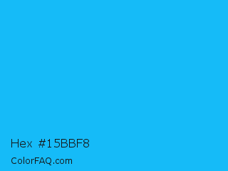 Hex #15bbf8 Color is a normal blue color and the nearest color is Spiro Disco Ball #0fc0fc. Hex code #15bbf8 and RGB value is rgb(21,187,248). In RGB color space, this color is composed of 8% red, 73% green, 97% blue, In CMYK color space, this color is composed of 92% cyan, 25% magenta, 0% yellow , 3% black , In HSL color space, this color has a hue angle of 196° , 94% saturation and 53% lightness.