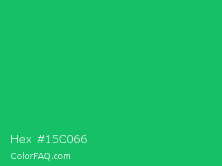 Hex #15c066 Color is a normal green color and the nearest color is Green Crayola #1cac78. Hex code #15c066 and RGB value is rgb(21,192,102). In RGB color space, this color is composed of 8% red, 75% green, 40% blue, In CMYK color space, this color is composed of 89% cyan, 0% magenta, 47% yellow , 25% black , In HSL color space, this color has a hue angle of 148° , 80% saturation and 42% lightness.