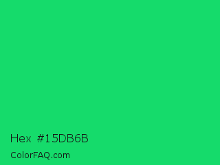 Hex #15db6b Color is a normal green color and the nearest color is Malachite #0bda51. Hex code #15db6b and RGB value is rgb(21,219,107). In RGB color space, this color is composed of 8% red, 86% green, 42% blue, In CMYK color space, this color is composed of 90% cyan, 0% magenta, 51% yellow , 14% black , In HSL color space, this color has a hue angle of 146° , 83% saturation and 47% lightness.