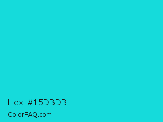 Hex #15dbdb Color is a normal cyan color and the nearest color is Bright Turquoise #08e8de. Hex code #15dbdb and RGB value is rgb(21,219,219). In RGB color space, this color is composed of 8% red, 86% green, 86% blue, In CMYK color space, this color is composed of 90% cyan, 0% magenta, 0% yellow , 14% black , In HSL color space, this color has a hue angle of 180° , 83% saturation and 47% lightness.