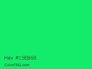 Hex #15eb6b Color is a normal green color and the nearest color is Malachite #0bda51. Hex code #15eb6b and RGB value is rgb(21,235,107). In RGB color space, this color is composed of 8% red, 92% green, 42% blue, In CMYK color space, this color is composed of 91% cyan, 0% magenta, 54% yellow , 8% black , In HSL color space, this color has a hue angle of 144° , 84% saturation and 50% lightness.