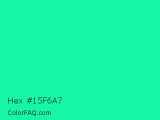 Hex #15f6a7 Color is a normal green color and the nearest color is Medium Spring Green #00fa9a. Hex code #15f6a7 and RGB value is rgb(21,246,167). In RGB color space, this color is composed of 8% red, 96% green, 65% blue, In CMYK color space, this color is composed of 91% cyan, 0% magenta, 32% yellow , 4% black , In HSL color space, this color has a hue angle of 159° , 93% saturation and 52% lightness.