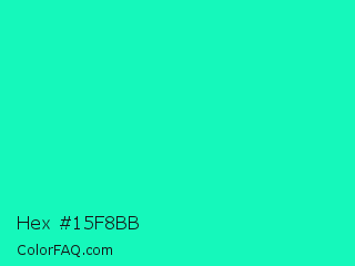 Hex #15f8bb Color is a normal cyan color and the nearest color is Medium Spring Green #00fa9a. Hex code #15f8bb and RGB value is rgb(21,248,187). In RGB color space, this color is composed of 8% red, 97% green, 73% blue, In CMYK color space, this color is composed of 92% cyan, 0% magenta, 25% yellow , 3% black , In HSL color space, this color has a hue angle of 164° , 94% saturation and 53% lightness.