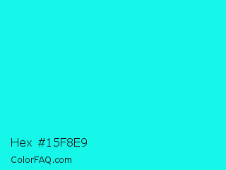 Hex #15f8e9 Color is a normal cyan color and the nearest color is Loeen #15f2fd. Hex code #15f8e9 and RGB value is rgb(21,248,233). In RGB color space, this color is composed of 8% red, 97% green, 91% blue, In CMYK color space, this color is composed of 92% cyan, 0% magenta, 6% yellow , 3% black , In HSL color space, this color has a hue angle of 176° , 94% saturation and 53% lightness.