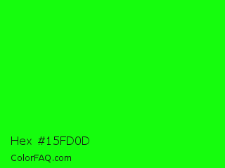 Hex #15fd0d Color is a normal green color and the nearest color is Green #00ff00. Hex code #15fd0d and RGB value is rgb(21,253,13). In RGB color space, this color is composed of 8% red, 99% green, 5% blue, In CMYK color space, this color is composed of 92% cyan, 0% magenta, 95% yellow , 1% black , In HSL color space, this color has a hue angle of 118° , 98% saturation and 52% lightness.