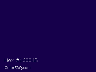 Hex #16004b Color is a very dark indigo color and the nearest color is Tolopea #1b0245. Hex code #16004b and RGB value is rgb(22,0,75). In RGB color space, this color is composed of 9% red, 0% green, 29% blue, In CMYK color space, this color is composed of 71% cyan, 100% magenta, 0% yellow , 71% black , In HSL color space, this color has a hue angle of 258° , 100% saturation and 15% lightness.
