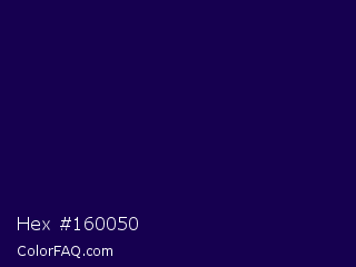 Hex #160050 Color is a very dark indigo color and the nearest color is Tolopea #1b0245. Hex code #160050 and RGB value is rgb(22,0,80). In RGB color space, this color is composed of 9% red, 0% green, 31% blue, In CMYK color space, this color is composed of 73% cyan, 100% magenta, 0% yellow , 69% black , In HSL color space, this color has a hue angle of 257° , 100% saturation and 16% lightness.
