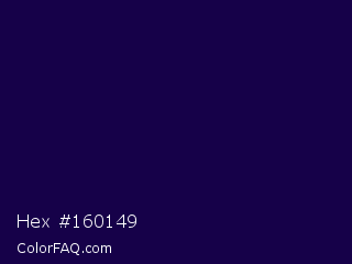 Hex #160149 Color is a very dark indigo color and the nearest color is Tolopea #1b0245. Hex code #160149 and RGB value is rgb(22,1,73). In RGB color space, this color is composed of 9% red, 0% green, 29% blue, In CMYK color space, this color is composed of 70% cyan, 99% magenta, 0% yellow , 71% black , In HSL color space, this color has a hue angle of 258° , 97% saturation and 15% lightness.