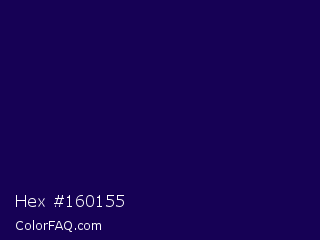 Hex #160155 Color is a very dark indigo color and the nearest color is Tolopea #1b0245. Hex code #160155 and RGB value is rgb(22,1,85). In RGB color space, this color is composed of 9% red, 0% green, 33% blue, In CMYK color space, this color is composed of 74% cyan, 99% magenta, 0% yellow , 67% black , In HSL color space, this color has a hue angle of 255° , 98% saturation and 17% lightness.