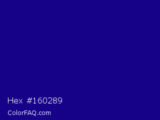 Hex #160289 Color is a dark indigo color and the nearest color is Ultramarine #120a8f. Hex code #160289 and RGB value is rgb(22,2,137). In RGB color space, this color is composed of 9% red, 1% green, 54% blue, In CMYK color space, this color is composed of 84% cyan, 99% magenta, 0% yellow , 46% black , In HSL color space, this color has a hue angle of 249° , 97% saturation and 27% lightness.