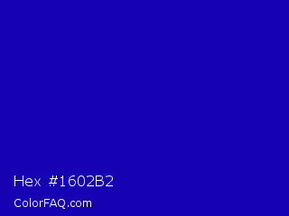 Hex #1602b2 Color is a normal indigo color and the nearest color is Zaffre #0014a8. Hex code #1602b2 and RGB value is rgb(22,2,178). In RGB color space, this color is composed of 9% red, 1% green, 70% blue, In CMYK color space, this color is composed of 88% cyan, 99% magenta, 0% yellow , 30% black , In HSL color space, this color has a hue angle of 247° , 98% saturation and 35% lightness.