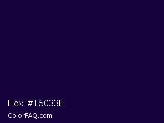 Hex #16033e Color is a very dark indigo color and the nearest color is Tolopea #1b0245. Hex code #16033e and RGB value is rgb(22,3,62). In RGB color space, this color is composed of 9% red, 1% green, 24% blue, In CMYK color space, this color is composed of 65% cyan, 95% magenta, 0% yellow , 76% black , In HSL color space, this color has a hue angle of 259° , 91% saturation and 13% lightness.