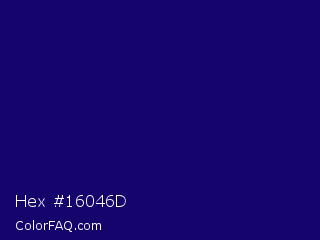 Hex #16046d Color is a very dark indigo color and the nearest color is Arapawa #110c6c. Hex code #16046d and RGB value is rgb(22,4,109). In RGB color space, this color is composed of 9% red, 2% green, 43% blue, In CMYK color space, this color is composed of 80% cyan, 96% magenta, 0% yellow , 57% black , In HSL color space, this color has a hue angle of 250° , 93% saturation and 22% lightness.