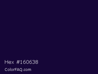 Hex #160638 Color is a very dark indigo color and the nearest color is Black Rock #0d0332. Hex code #160638 and RGB value is rgb(22,6,56). In RGB color space, this color is composed of 9% red, 2% green, 22% blue, In CMYK color space, this color is composed of 61% cyan, 89% magenta, 0% yellow , 78% black , In HSL color space, this color has a hue angle of 259° , 81% saturation and 12% lightness.