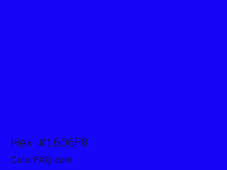 Hex #1606f8 Color is a normal indigo color and the nearest color is Blue #0000ff. Hex code #1606f8 and RGB value is rgb(22,6,248). In RGB color space, this color is composed of 9% red, 2% green, 97% blue, In CMYK color space, this color is composed of 91% cyan, 98% magenta, 0% yellow , 3% black , In HSL color space, this color has a hue angle of 244° , 95% saturation and 50% lightness.