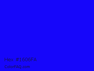 Hex #1606fa Color is a normal indigo color and the nearest color is Blue #0000ff. Hex code #1606fa and RGB value is rgb(22,6,250). In RGB color space, this color is composed of 9% red, 2% green, 98% blue, In CMYK color space, this color is composed of 91% cyan, 98% magenta, 0% yellow , 2% black , In HSL color space, this color has a hue angle of 244° , 96% saturation and 50% lightness.
