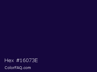 Hex #16073e Color is a very dark indigo color and the nearest color is Tolopea #1b0245. Hex code #16073e and RGB value is rgb(22,7,62). In RGB color space, this color is composed of 9% red, 3% green, 24% blue, In CMYK color space, this color is composed of 65% cyan, 89% magenta, 0% yellow , 76% black , In HSL color space, this color has a hue angle of 256° , 80% saturation and 14% lightness.