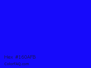 Hex #160afb Color is a normal indigo color and the nearest color is Bluebonnet #1c1cf0. Hex code #160afb and RGB value is rgb(22,10,251). In RGB color space, this color is composed of 9% red, 4% green, 98% blue, In CMYK color space, this color is composed of 91% cyan, 96% magenta, 0% yellow , 2% black , In HSL color space, this color has a hue angle of 243° , 97% saturation and 51% lightness.
