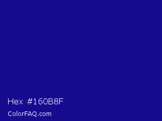 Hex #160b8f Color is a dark indigo color and the nearest color is Ultramarine #120a8f. Hex code #160b8f and RGB value is rgb(22,11,143). In RGB color space, this color is composed of 9% red, 4% green, 56% blue, In CMYK color space, this color is composed of 85% cyan, 92% magenta, 0% yellow , 44% black , In HSL color space, this color has a hue angle of 245° , 86% saturation and 30% lightness.