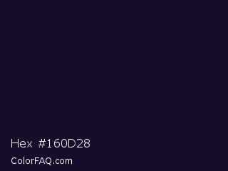 Hex #160d28 Color is a very dark indigo color and the nearest color is Mirage #161928. Hex code #160d28 and RGB value is rgb(22,13,40). In RGB color space, this color is composed of 9% red, 5% green, 16% blue, In CMYK color space, this color is composed of 45% cyan, 68% magenta, 0% yellow , 84% black , In HSL color space, this color has a hue angle of 260° , 51% saturation and 10% lightness.