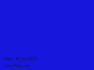 Hex #1616dd Color is a normal blue color and the nearest color is Bluebonnet #1c1cf0. Hex code #1616dd and RGB value is rgb(22,22,221). In RGB color space, this color is composed of 9% red, 9% green, 87% blue, In CMYK color space, this color is composed of 90% cyan, 90% magenta, 0% yellow , 13% black , In HSL color space, this color has a hue angle of 240° , 82% saturation and 48% lightness.