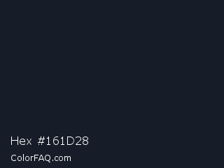 Hex #161d28 Color is a very dark blue color and the nearest color is Mirage #161928. Hex code #161d28 and RGB value is rgb(22,29,40). In RGB color space, this color is composed of 9% red, 11% green, 16% blue, In CMYK color space, this color is composed of 45% cyan, 28% magenta, 0% yellow , 84% black , In HSL color space, this color has a hue angle of 217° , 29% saturation and 12% lightness.