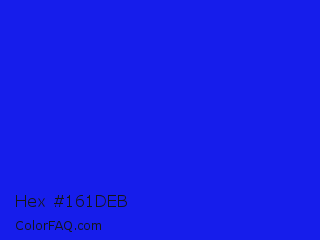 Hex #161deb Color is a normal blue color and the nearest color is Bluebonnet #1c1cf0. Hex code #161deb and RGB value is rgb(22,29,235). In RGB color space, this color is composed of 9% red, 11% green, 92% blue, In CMYK color space, this color is composed of 91% cyan, 88% magenta, 0% yellow , 8% black , In HSL color space, this color has a hue angle of 238° , 84% saturation and 50% lightness.