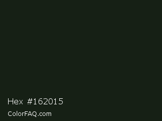 Hex #162015 Color is a very dark green color and the nearest color is Hunter Green #161d10. Hex code #162015 and RGB value is rgb(22,32,21). In RGB color space, this color is composed of 9% red, 13% green, 8% blue, In CMYK color space, this color is composed of 31% cyan, 0% magenta, 34% yellow , 87% black , In HSL color space, this color has a hue angle of 115° , 21% saturation and 10% lightness.