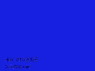 Hex #1620de Color is a normal blue color and the nearest color is Bluebonnet #1c1cf0. Hex code #1620de and RGB value is rgb(22,32,222). In RGB color space, this color is composed of 9% red, 13% green, 87% blue, In CMYK color space, this color is composed of 90% cyan, 86% magenta, 0% yellow , 13% black , In HSL color space, this color has a hue angle of 237° , 82% saturation and 48% lightness.