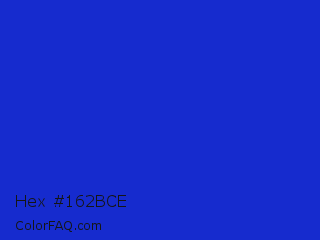 Hex #162bce Color is a normal blue color and the nearest color is Persian Blue #1c39bb. Hex code #162bce and RGB value is rgb(22,43,206). In RGB color space, this color is composed of 9% red, 17% green, 81% blue, In CMYK color space, this color is composed of 89% cyan, 79% magenta, 0% yellow , 19% black , In HSL color space, this color has a hue angle of 233° , 81% saturation and 45% lightness.