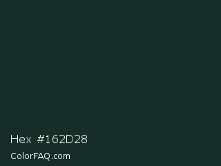 Hex #162d28 Color is a very dark cyan color and the nearest color is Timber Green #16322c. Hex code #162d28 and RGB value is rgb(22,45,40). In RGB color space, this color is composed of 9% red, 18% green, 16% blue, In CMYK color space, this color is composed of 51% cyan, 0% magenta, 11% yellow , 82% black , In HSL color space, this color has a hue angle of 167° , 34% saturation and 13% lightness.
