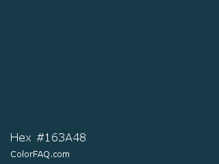 Hex #163a48 Color is a very dark blue color and the nearest color is Elephant #123447. Hex code #163a48 and RGB value is rgb(22,58,72). In RGB color space, this color is composed of 9% red, 23% green, 28% blue, In CMYK color space, this color is composed of 69% cyan, 19% magenta, 0% yellow , 72% black , In HSL color space, this color has a hue angle of 197° , 53% saturation and 18% lightness.
