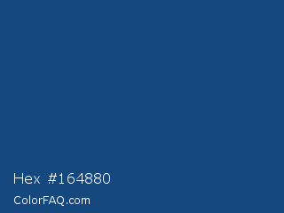Hex #164880 Color is a dark blue color and the nearest color is Dark Cerulean #08457e. Hex code #164880 and RGB value is rgb(22,72,128). In RGB color space, this color is composed of 9% red, 28% green, 50% blue, In CMYK color space, this color is composed of 83% cyan, 44% magenta, 0% yellow , 50% black , In HSL color space, this color has a hue angle of 212° , 71% saturation and 29% lightness.