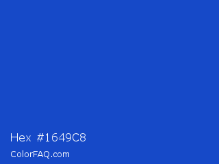 Hex #1649c8 Color is a normal blue color and the nearest color is New Car #214fc6. Hex code #1649c8 and RGB value is rgb(22,73,200). In RGB color space, this color is composed of 9% red, 29% green, 78% blue, In CMYK color space, this color is composed of 89% cyan, 64% magenta, 0% yellow , 22% black , In HSL color space, this color has a hue angle of 223° , 80% saturation and 44% lightness.