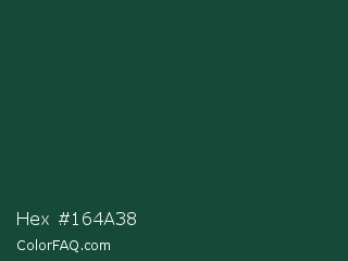Hex #164a38 Color is a very dark green color and the nearest color is MSU Green #18453b. Hex code #164a38 and RGB value is rgb(22,74,56). In RGB color space, this color is composed of 9% red, 29% green, 22% blue, In CMYK color space, this color is composed of 70% cyan, 0% magenta, 24% yellow , 71% black , In HSL color space, this color has a hue angle of 159° , 54% saturation and 19% lightness.