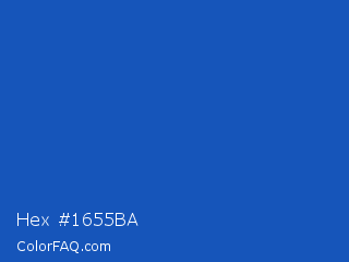 Hex #1655ba Color is a normal blue color and the nearest color is Sapphire #0f52ba. Hex code #1655ba and RGB value is rgb(22,85,186). In RGB color space, this color is composed of 9% red, 33% green, 73% blue, In CMYK color space, this color is composed of 88% cyan, 54% magenta, 0% yellow , 27% black , In HSL color space, this color has a hue angle of 217° , 79% saturation and 41% lightness.