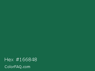Hex #166848 Color is a dark green color and the nearest color is Jewel #126b40. Hex code #166848 and RGB value is rgb(22,104,72). In RGB color space, this color is composed of 9% red, 41% green, 28% blue, In CMYK color space, this color is composed of 79% cyan, 0% magenta, 31% yellow , 59% black , In HSL color space, this color has a hue angle of 157° , 65% saturation and 25% lightness.