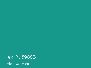 Hex #16988b Color is a normal cyan color and the nearest color is Niagara #06a189. Hex code #16988b and RGB value is rgb(22,152,139). In RGB color space, this color is composed of 9% red, 60% green, 55% blue, In CMYK color space, this color is composed of 86% cyan, 0% magenta, 9% yellow , 40% black , In HSL color space, this color has a hue angle of 174° , 75% saturation and 34% lightness.